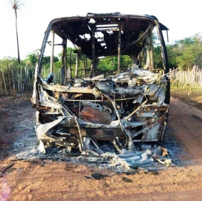 Um ônibus que faz o transporte de passageiros ficou totalmente destruído pelo fogo na noite desta sexta-feira (17), na localidade Currais, interior de Batalha.