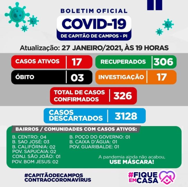 O número de mortes subiou para 3 ocorrencias e os casos confirmados no município são 326 casos registrados como positivo para covid-19.