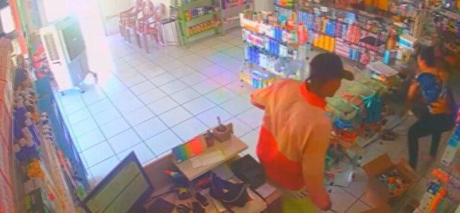 Nas imagens o bandido entra na farmácia por volta das 13h30 e finge ser cliente, enquanto o comparsa fica do lado de fora observando a movimentação.