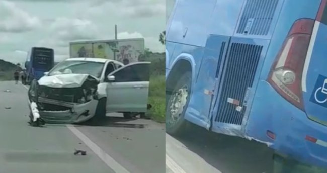 Segundo informações de populares, o carro perdeu o controle ao desviar de um buraco, colidindo violentamente contra o ônibus que trafegava no sentido oposto.