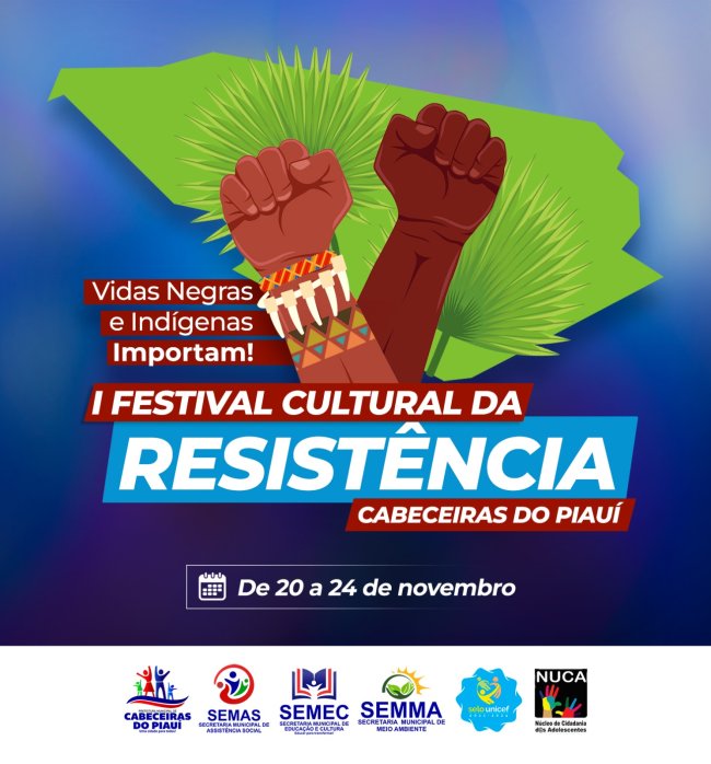 A Prefeitura Municipal de Cabeceiras do Piauí, através do Núcleo de Cidadania dos Adolescentes - NUCA (Selo Unicef), está organizando a primeira edição do Festival Cultural da Resistência, que acontecerá de 20 a 24 de novembro de 2023.