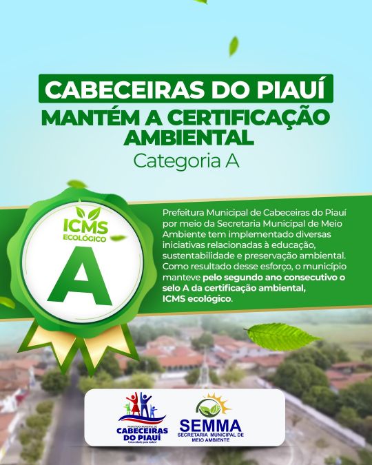 O município de Cabeceiras do Piauí conquistou o Selo Ambiental na categoria A do ICMS Ecológico.