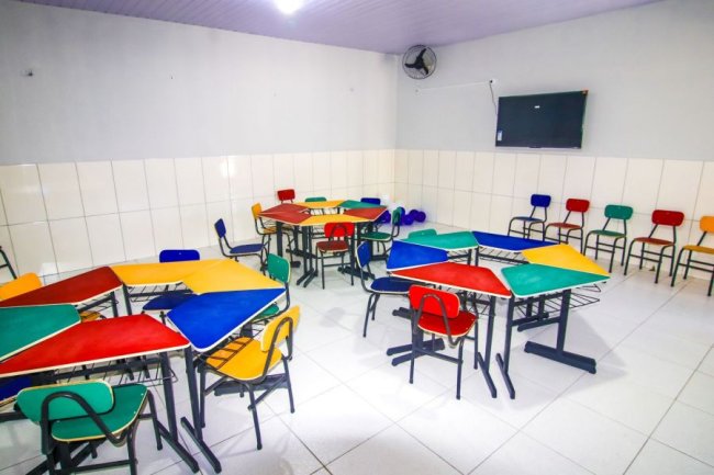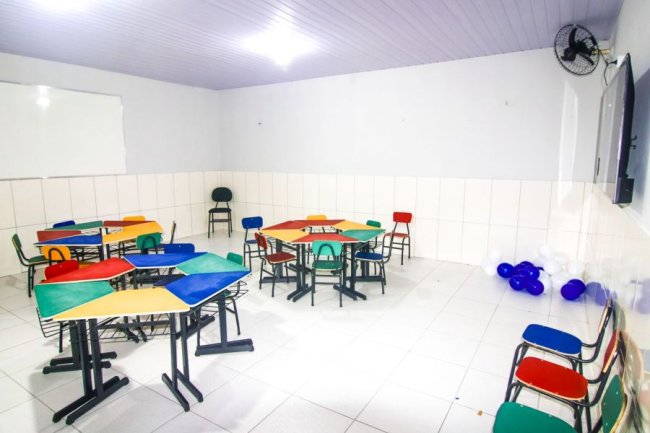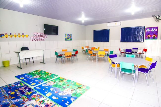 Com refeitório, salas climatizadas, tv, mesas e cadeiras infantis, banheiros adaptados, a escola fica localizada no centro da cidade e agora conta com toda estrutura necessária para atender quase 200 crianças do município.