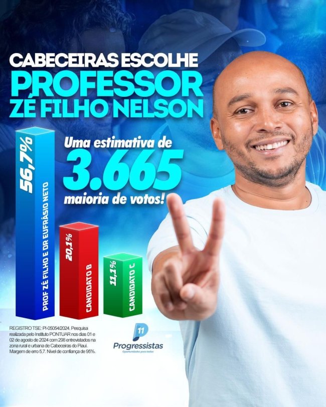 O prefeito do município de Cabeceiras do Piauí, professor Zé Filho Nelson, pré-candidato a reeleição lidera na preferência do eleitorado do município, segundo pesquisa do Instituto Pontuar, divulgada neste domingo (10/08).