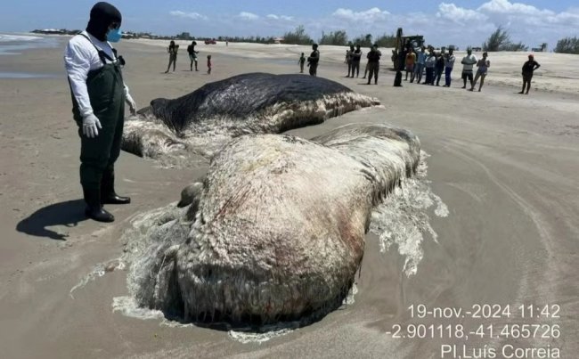 A baleia foi encontrada morta na beira do mar na manhã desta terça-feira (19). Equipes da prefeitura de Luís Correia e do Instituto de Conservação da Biodiversidade (ICMBio) estão no local e avaliam a melhor forma de retirar a carcaça do animal.