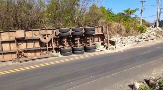 Motorista sofre ferimentos leves e carga espalhada na pista provoca interdição parcial da rodovia