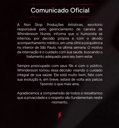 "Sempre preocupado com seus fãs e com o público, Whindersson tomou essa decisão visando o cuidado integral de sua saúde. Ele está muito bem, feliz com sua evolução e, em breve, estará de volta aos palcos fazendo o que mais ama. Agradecemos a compreensão de todos e ressaltamos que a privacidade e o respeito são fundamentais neste momento", concluiu a equipe do artista.