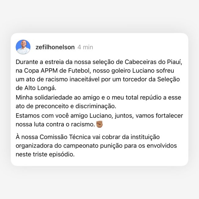 O prefeito de Cabeceiras do Piauí, professor Zé Filho, divulgou uma nota de repúdio em sua rede social sobre um caso de racismo sofrido contra o goleiro da seleção de Cabeceiras do Piauí identificado como Luciano durante o jogo de estreia na Copa APPM no município de Alto Longá.