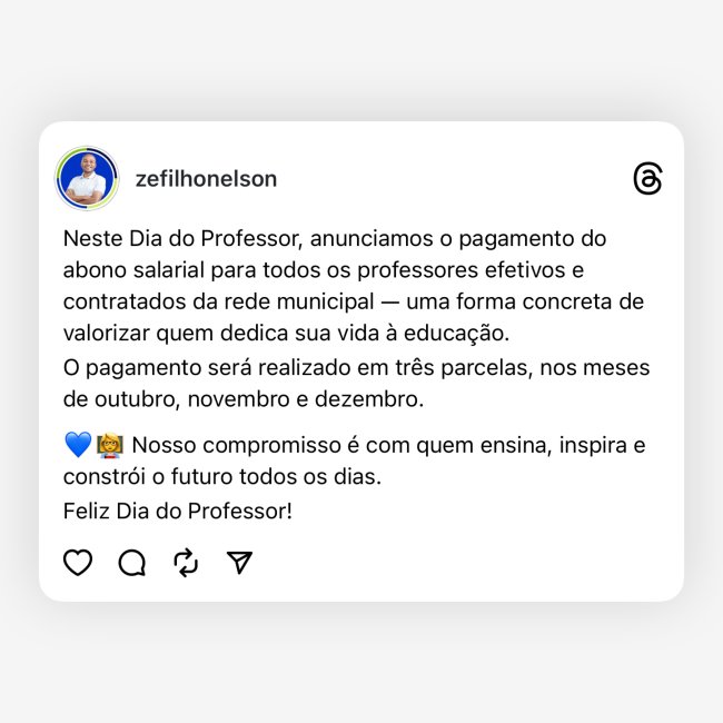 De acordo com a prefeitura, o pagamento será realizado em três parcelas, nos meses de outubro, novembro e dezembro, como forma de valorização e reconhecimento dos profissionais da educação.