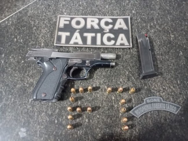 Junto dele, os policiais encontraram e apreenderam uma pistola calibre .380, municiada com 16 projéteis e com numeração raspada.