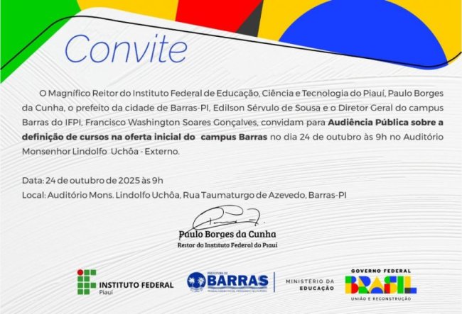 Uma audiência pública será realizada no auditório Monsenhor Lindolfo Uchôa, no dia 24 de outubro às 09h em Barras, para discutir a escolha dos cursos que serão ofertados pelo Instituto Federal do Piauí (IFPI) no município. O encontro faz parte do processo de consulta pública que vai definir as áreas de formação mais adequadas às demandas locais.