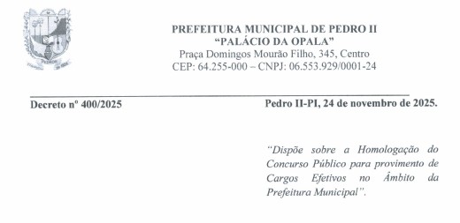 A Prefeitura de Pedro II publicou, nesta terça-feira (25), no Diário Oficial do Município, o Decreto nº 400/2025, que homologa oficialmente o Resultado Final do Concurso Público regido pelo Edital nº 001/2023.