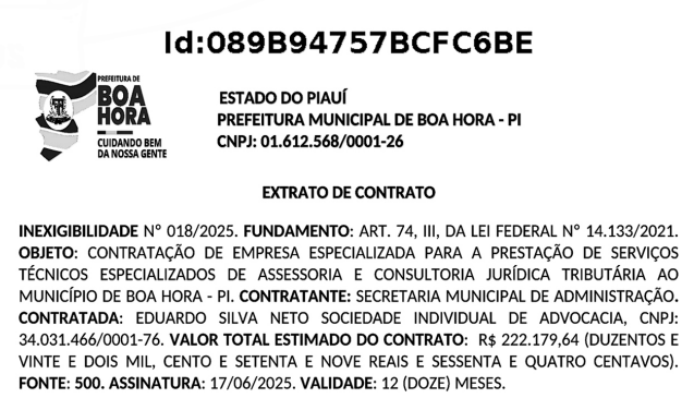 O acordo foi celebrado com a empresa Eduardo Silva Neto Sociedade Individual de Advocacia, especializada em serviços de assessoria e consultoria jurídica tributária. Conforme o documento, a contratação tem como objetivo prestar suporte técnico ao Município de Boa Hora na área tributária.