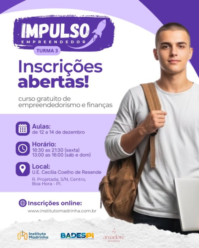 A cidade de Boa Hora, no norte do estado, sediará a terceira turma do Projeto Impulso Empreendedor, iniciativa desenvolvida pela Agência de Fomento e Desenvolvimento do Estado do Piauí (Badespi), em parceria com o Instituto Madrinha. A capacitação é gratuita e será realizada nos dias 12, 13 e 14 de dezembro, na Unidade Escolar Cecília Coelho de Resende, com o objetivo de qualificar empreendedores da região, impulsionar pequenos negócios e ampliar oportunidades de geração de renda. As inscrições já estão abertas e podem ser feitas de forma online pelo site: institutomadrinha.com.br/inscricoes/