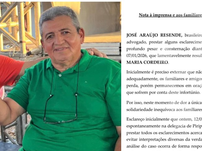 Por isso, neste momento de dor a única prioridade é levar por meio desta Nota a solidariedade inequívoca aos familiares e amigos da D. Francisca Maria. Esclareço inicialmente que ontem, 12/01/2026, o Sr. Resende Araújo compareceu espontaneamente na delegacia de Piripiri-PI, perante a autoridade policial, para prestar todos os esclarecimentos acerca do acidente acima reportado, de modo a evitar interpretações diversas da verdadeira, bem como para assegurar que a análise do caso ocorra de forma responsável, imparcial e em estrito respeito a todos os envolvidos no fatídico acidente.