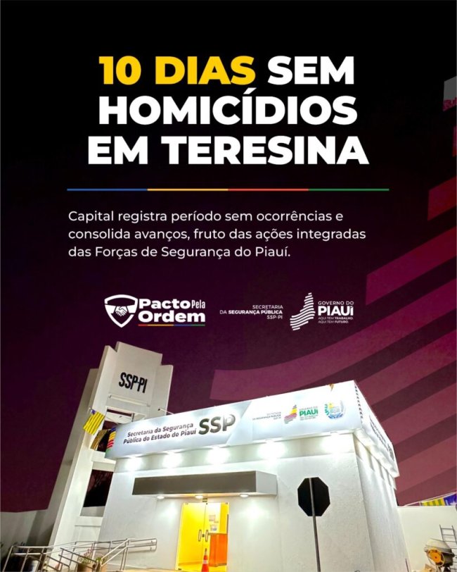 A capital piauiense, Teresina, registrou 10 dias consecutivos sem casos de homicídios nos primeiros 15 dias de janeiro de 2026. A informação foi divulgada, nesta sexta-feira (16), pela Secretaria da Segurança Pública do Piauí (SSP-PI), por meio da Gerência de Análise Criminal e Estatística (GACE).