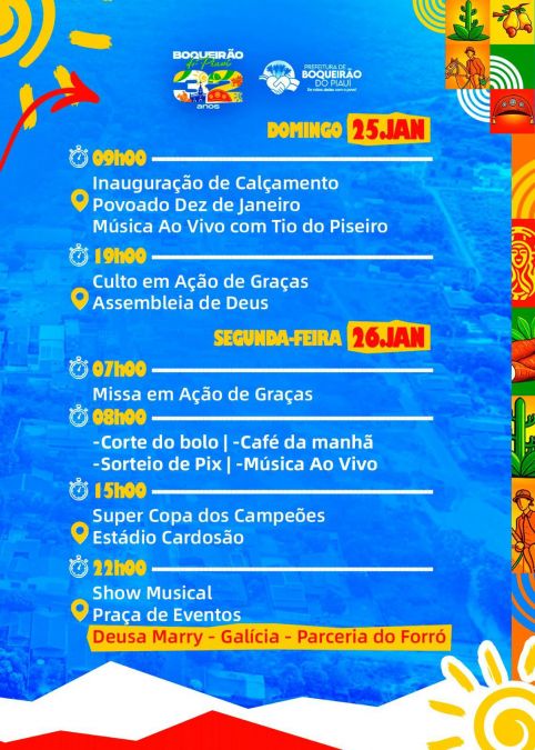 A Prefeitura de Boqueirão do Piauí divulgou a programação oficial em comemoração aos 32 anos de emancipação política do município. As atividades acontecem nos dias 25 e 26 de janeiro e incluem inauguração de obras, momentos religiosos, programação esportiva e shows musicais.