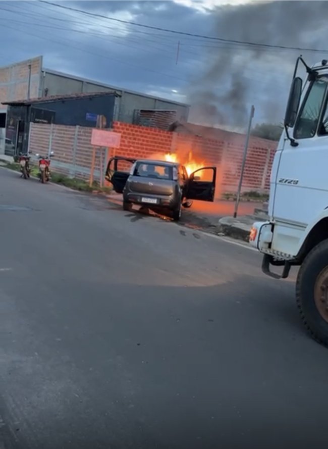 Fogo começou na parte frontal do Fiat Uno e mobilizou moradores, que acionaram carro-pipa para conter as chamas; ninguém ficou ferido.