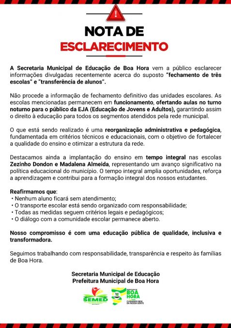 Uma nota de esclarecimento divulgada pela Prefeitura de Boa Hora mantém o posicionamento da gestão em relação à transferência de estudantes da comunidade Seriema para a escola da comunidade Lagoa Seca, mesmo após a mobilização de pais que organizaram abaixo-assinado solicitando a manutenção das aulas na própria localidade e encaminharam o documento à Secretaria Municipal de Educação.