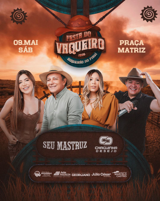 Já a Festa do Vaqueiro terá shows de Seu Mastruz e Chaguinha Desejo, reforçando o clima de tradição e cultura nordestina que marca o evento.