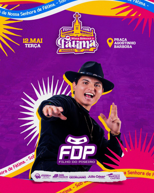 Encerrando a programação festiva, no dia 12 de maio, data dedicada a Nossa Senhora de Fátima, o público poderá acompanhar o show de Filho do Piseiro, fenômeno do momento e destaque nas redes sociais.