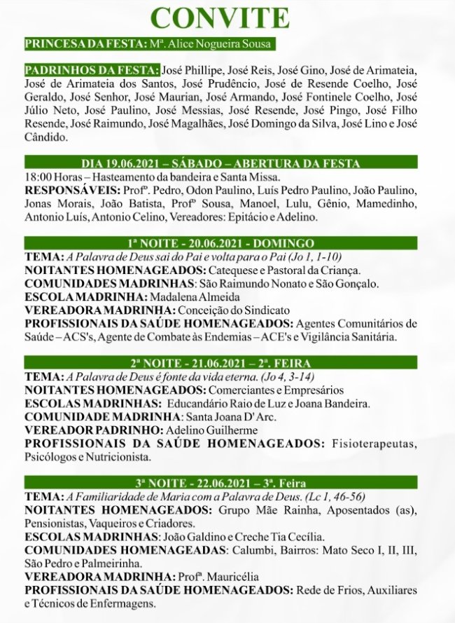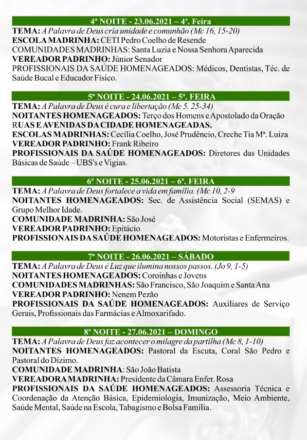 O festejo do Padroeiro da cidade segue até o dia 29 de junho, onde todas as noites são celebradas novenas em homenagem ao Santo.