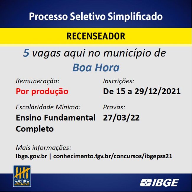 Em Boa Hora são oferecidas 5 vagas para o cargo de recenseador e 1 vaga para o cargo de Agente Censitário Municipal