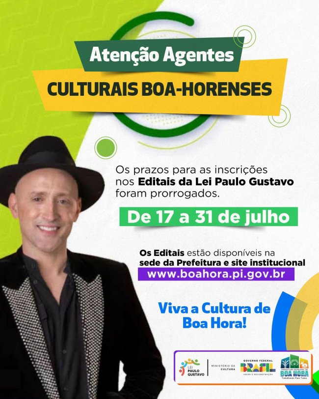 A Prefeitura de Boa Hora anuncia a prorrogação dos editais de chamamento público da Lei Paulo Gustavo, uma iniciativa voltada para o fortalecimento da cultura e promoção de atividades educacionais no município como oportunidade para os artistas e educadores locais compartilharem seu talento e contribuírem para o desenvolvimento cultural da cidade.