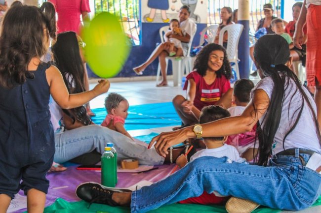 O objetivo do encontro é trabalhar o desenvolvimento infantil de crianças de 0 aos 6 anos de idade com atividades lúdicas. O encontro contou ainda com a participação de gestantes, crianças e de suas famílias.