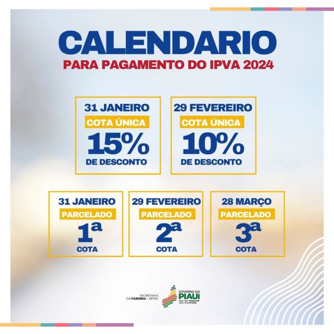 O Governo do Estado, por meio da Secretaria da Fazenda (Sefaz), informa que já está disponível o boleto para pagamento do IPVA 2024, com desconto de 15% no valor para pagamento à vista, até o dia 31 deste mês. O calendário de pagamento do IPVA 2024 foi publicado no Diário Oficial do Estado, por meio de instrução normativa (SEFAZ-PI/GASEC/SUPREC/UNATRI Nº 1/2023), no dia 7 de dezembro de 2023.