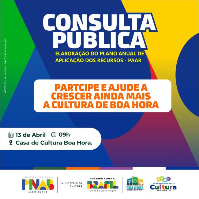 A Prefeitura Municipal de Boa Hora através da Secretaria Municipal de Cultura vai realiza no próximo sábado (13), uma consulta Pública para garantir a participação efetiva da sociedade civil na construção do Planejamento da Política Nacional Aldir Blanc – PNAB.