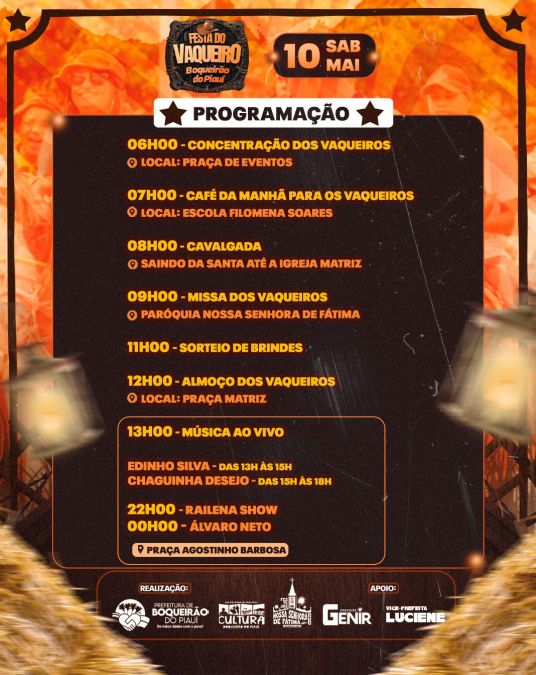 A Programação dos Festejos de Nossa Senhora de Fátima no próximo sábado (10), no município de Boqueirão do Piauí vai celebrar o dia do vaqueiro.