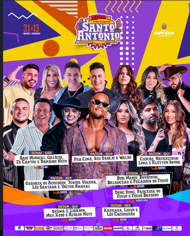 O Prefeito de Campo Maior, Joãozinho Félix, divulgou neste domingo (18), quase 30 atrações que devem se apresentar na Arena de Shows durante os Festejos de Santo Antônio.