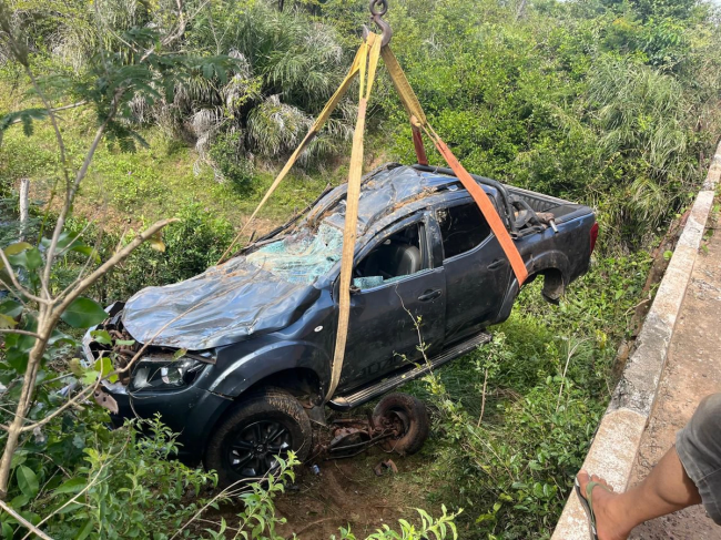 Um carro de passeio com seis ocupantes perdeu o controle, caiu de uma ponte e capotou, resultando na morte de três pessoas e ferimentos em outras três