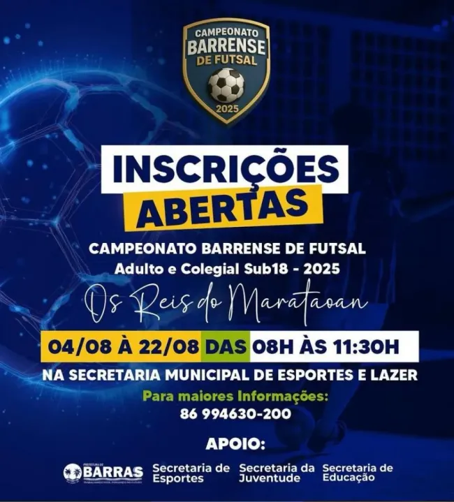 Prefeitura Municipal de Barras - através da secretaria Municipal de Esportes e Lazer (Semel), secretaria da Juventude e de Educação - está com inscrições abertas abertas para o CAMPEONATO BARRENSE DE FUTSAL ADULTO E COLEGIAL SUB-18 2025.