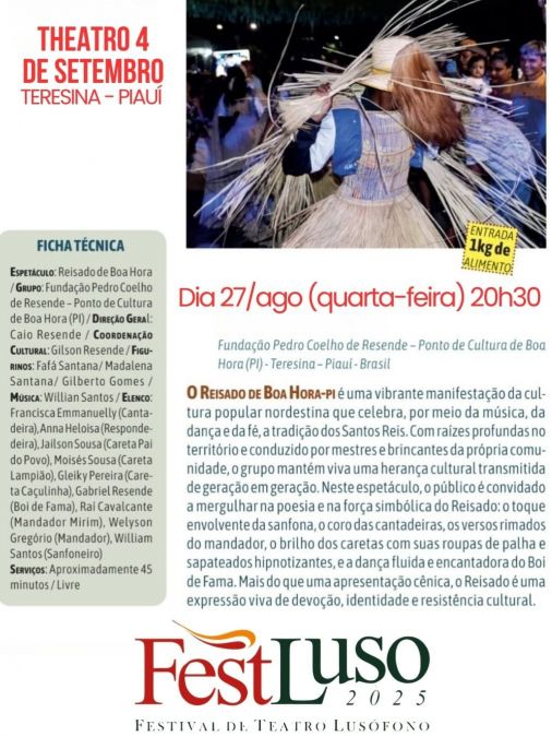 O Reisado de Boa Hora se apresentará no dia 27 de agosto, às 20h30, no Theatro 4 de Setembro, em Teresina, durante a programação oficial do FestLuso 2025 – Festival Internacional de Teatro Lusófono, que este ano celebra sua edição comemorativa de 15 anos.