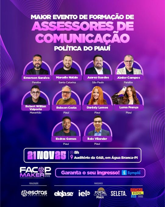 O município de Água Branca (PI) será palco, no dia 21 de novembro, do FACOP Maker 2025, o maior evento de formação de assessores de comunicação do Piauí. A imersão vai reunir profissionais, estudantes e gestores públicos interessados em aprimorar estratégias de comunicação política e digital.