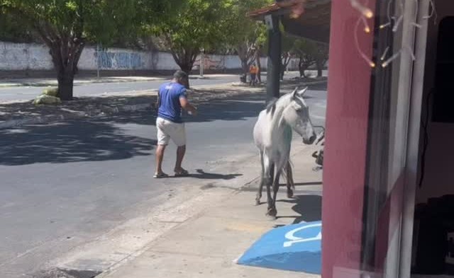 Nas imagens, o animal aparece se aproximando da porta do salão e tenta entrar mais uma vez, mas acaba esbarrando em uma motocicleta estacionada na entrada. Um homem que passava pelo local ajuda a afastar o cavalo, que insiste por alguns segundos antes de desistir e ir embora.