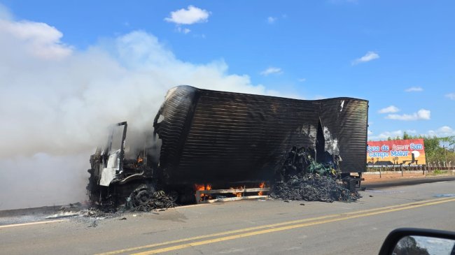 Motorista conseguiu escapar sem ferimentos, mas veículo ficou destruído; chamas se espalharam rapidamente e interditaram parte da rodovia.