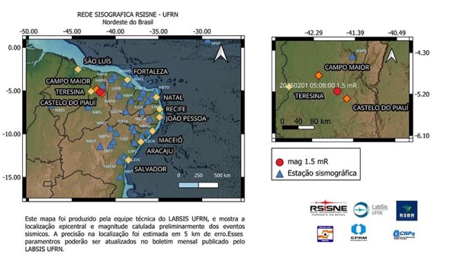 O Laboratório Sismológico da Universidade Federal do Rio Grande do Norte (LabSis) detectou um tremor de terras de magnitude 1,5 graus na escala Richter em áreas na zona rural do município de Castelo do Piauí (a 190 km de Teresina).
