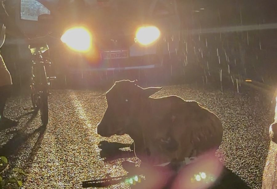 Uma das vacas permaneceu caída no meio da rodovia, bastante machucada. A outra, uma bezerra, ficou do lado oposto da pista, também ferida.