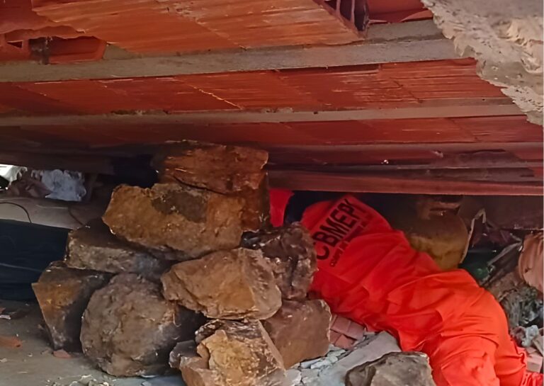Ao chegar ao local, a equipe encontrou a estrutura completamente comprometida e iniciou imediatamente os procedimentos de segurança para viabilizar o resgate. Foram realizadas escoras emergenciais para evitar novos desabamentos e garantir a integridade dos socorristas durante a operação.