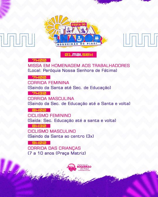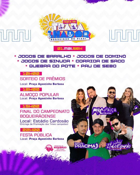 A Prefeitura de Boqueirão do Piauí divulgou a programação oficial da tradicional Festa do Trabalhador, que será realizada no dia 1º de maio. Consolidado no calendário do município, o evento celebra os trabalhadores e trabalhadoras com uma agenda diversificada, reunindo esporte, fé, lazer e música.